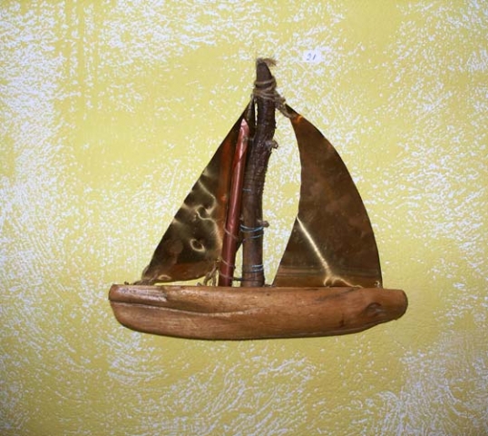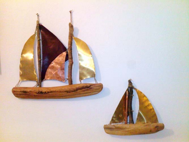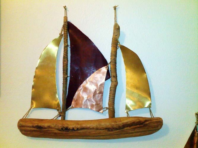 Θαλασσόξυλα, φύλλα μπρούντζου, φύλλα χαλκού, δέρμα, σύρμα, σπάγκος.