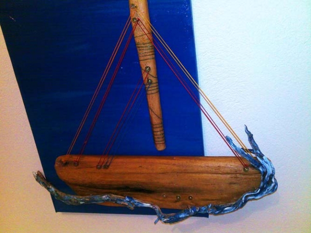 Καμβάς, ξύλινη επιφάνεια, θαλασσόξυλα , διακοσμητικό από κερωμένο σπάγκο.