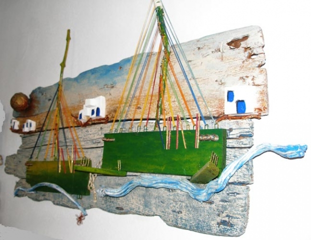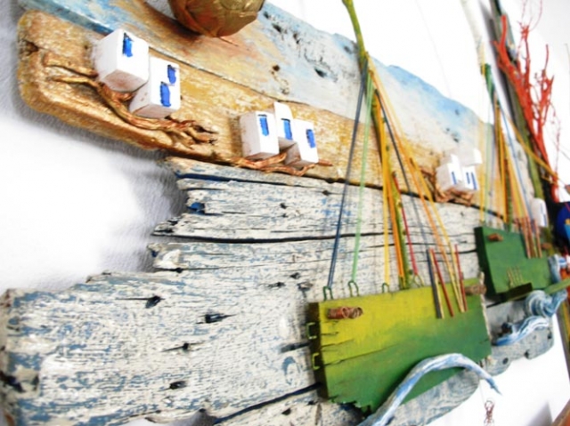 Παλαιό παραθυρόφυλλο, θαλασσόξυλα στη φυσική τους μορφή και επεξεργασμένα , κλαδιά, σύρμα χαλκού, κερωμένος σπάγκος .