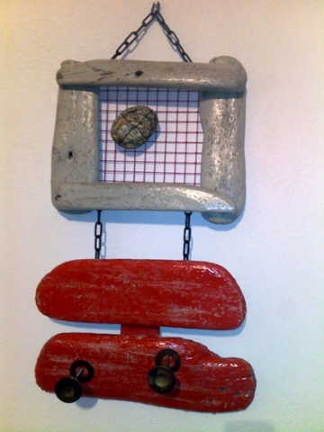 Θαλασσόξυλα, πλεγμα αλουμινίου, μεταλλική αλυσίδα, μεταλλικά διακοσμητικά στοιχεία, βότσαλο.