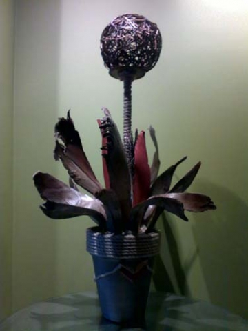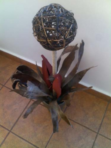 Dry pump leaves, metal, dry twigs embedded in ceramic pot.